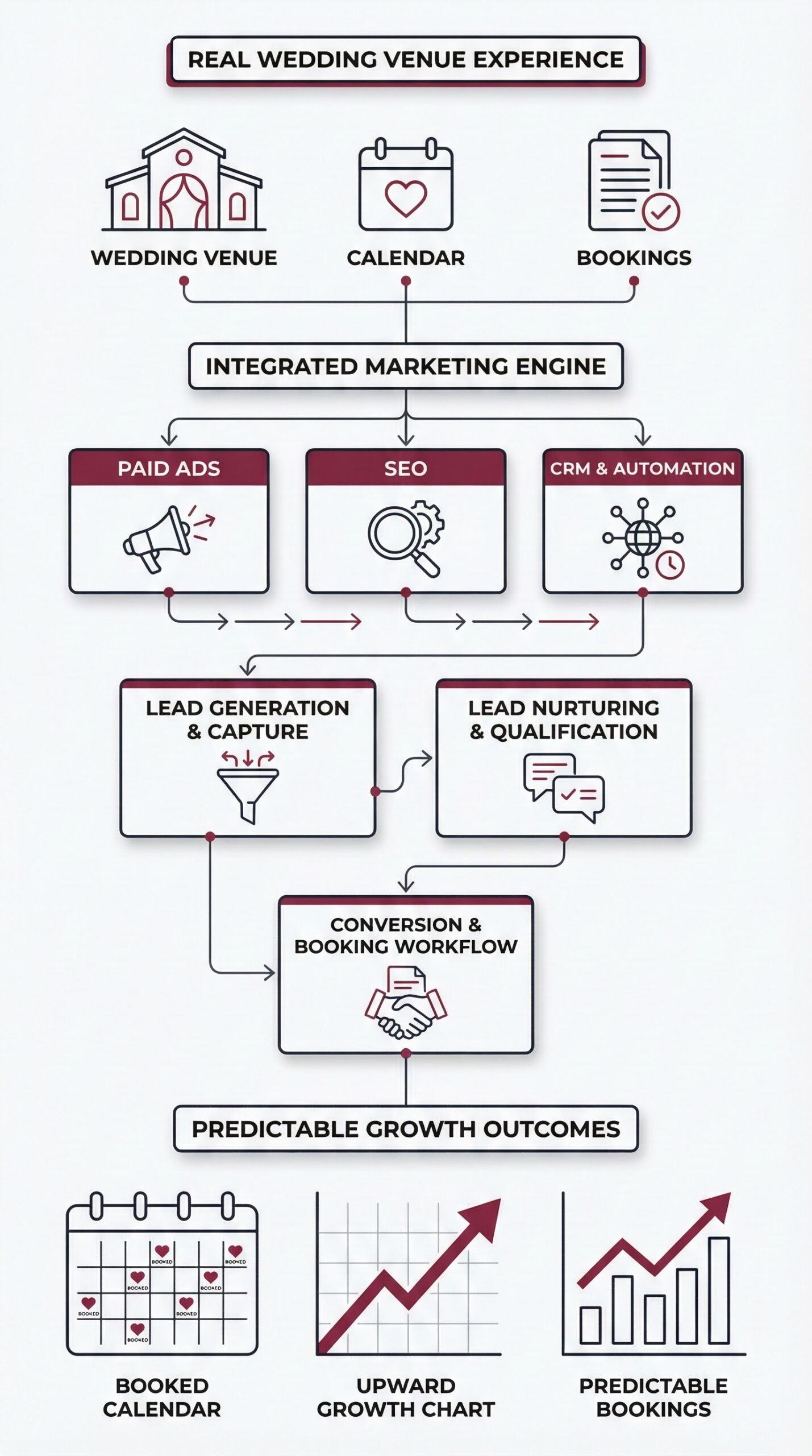 No gimmicks. No inflated claims. Just a transparent marketing system built for wedding venues that focuses on real demand, real tours, and real growth.